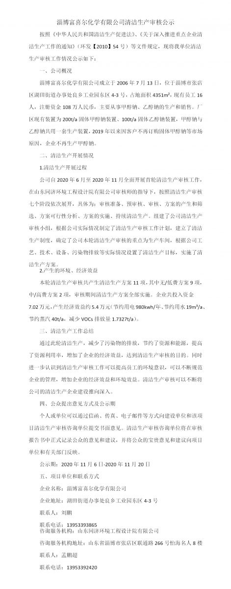 2020年11月5日淄博富喜爾化學(xué)有限公司清潔生產(chǎn)審核公示